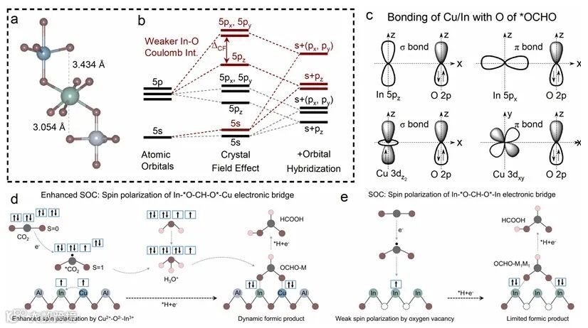 图1. (a) CuInAlO4的原子结构;(b) CuInAlO4(酒红色)与 In2O3(黑色)中 InO6单元内 In 的 5s-5p 杂化引起的能级分裂;(c) CuInAlO4中 Cu/In 与 *OCHO 中间体氧原子的键合作用;(d, e) CuInAlO4与In2O3的催化机理图。
