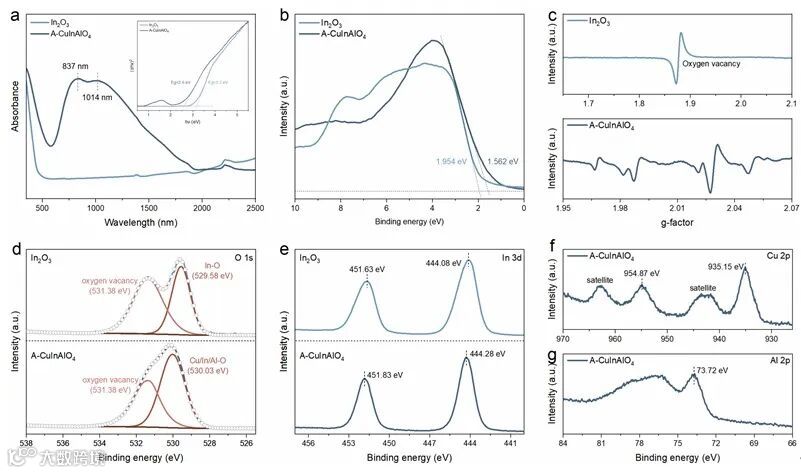 图3. A-CuInAlO4与商业 In2O3样品的电子结构表征。(a) 紫外-可见漫反射吸收光谱(插图为通过 Kubelka–Munk 函数转换得到的 Tauc 图,其中 Eg 为带隙);(b) XPS 价带谱;(c) EPR 光谱;(d~g) 高分辨 O 1s、In 3d、Cu 2p 及 Al 2p XPS 光谱。