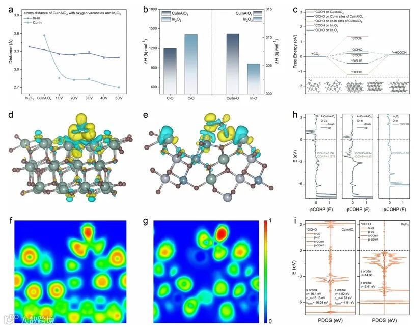 图5. (a) 基于径向分布函数的 In-In 与 In-Cu 原子间距;(b) A-CuInAlO4(015)晶面 Cu–OCHO-In 吸附模式与 In2O3(222)晶面 In–OCHO-In 吸附模式中 Cu–O 键和 O–C 键的焓变(ΔH)值;(c) 不同模型上OCHO 中间体吸附的吉布斯自由能;(d、e) 电子密度差分图;(f、g) 电子局域化函数(ELF)图(d、f 对应 In2O3吸附OCHO,e、g 对应 A-CuInAlO4吸附OCHO);(h) 金属位点与OCHO 中氧原子形成的 O-Cu 键和 O-In 键的晶体轨道哈密顿布居(COHP);(i) 吸附态 *OCHO 分子的 s 轨道与 p 轨道投影态密度(PDOS)。