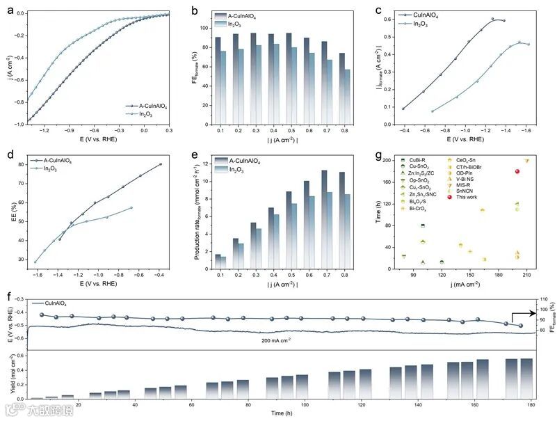 图4. A-CuInAlO4与商业In2O3样品在流动电解池(1 M KOH 为电解液)中的ECR性能。(a) 经 85% iR 校正的LSV曲线;(b) 不同电流密度下的FEformate;(c) jformate;(d) 半电池阴极能量效率;(e) 甲酸根产率;(f) A-CuInAlO4在总电流密度为 200 mA cm-2下的电化学稳定性测试;(g) 与已发表论文关于ECR制备甲酸根不同催化剂的稳定性及总电流密度对比。