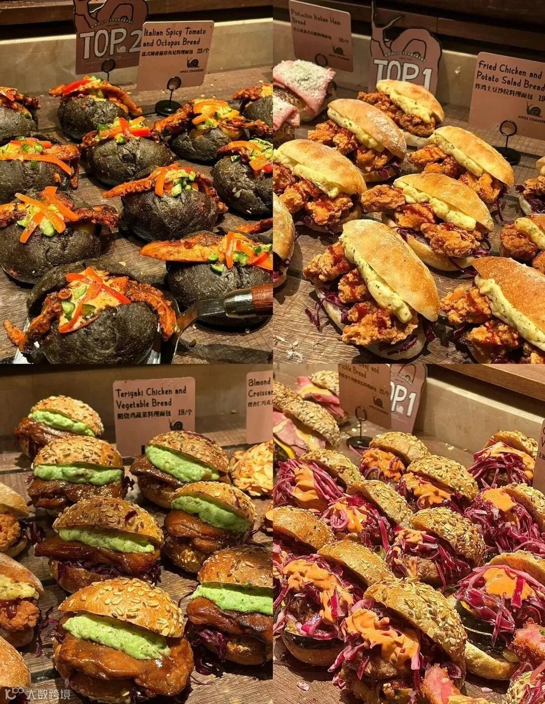 切开面包暴露多层次内馅:炸鸡的酥脆层叠土豆沙拉的绵密(图1/图9),章鱼足的弹性包裹熔岩芝士的流淌感(图7)。顶部装饰讲究“三秒定律”:撒糖霜如初雪,淋巧克力酱需保留滴落痕迹,新鲜水果丁带水珠更佳。