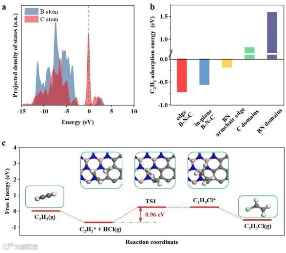 图5. DFT计算。(a)边缘B–N–C位点的B和C原子的PDOS。(b)乙炔在BNC不同位点及氮化硼扶手椅边缘位点的吸附能。(c)边缘B–N–C位点上乙炔氢氯化反应的能量分布及反应路径。注:白色、粉色、灰色、蓝色和绿色球分别代表H、B、C、N和Cl原子。