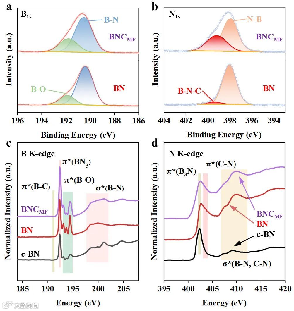 图2. BNCMF的电子显微镜表征。(a,b)高分辨透射电子显微镜图像。(c)场发射扫描电子显微镜-能量色散X射线光谱元素分布图。(d)扫描透射电子显微镜-电子能量损失谱元素分布图。