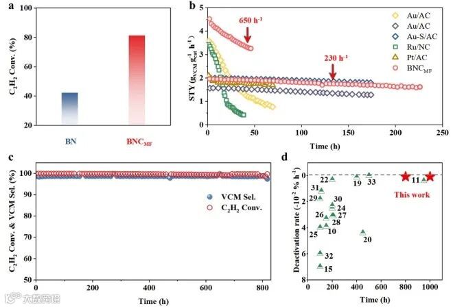 总之,该研究开发了一种高效的无金属BNC催化剂,其特征是氮化硼限域纳米石墨烯二维共生,产生丰富的界面B–N–C活性位点。研究人员利用电子显微镜、SHIM、STEM-EELS mapping、IR、UV-vis DRS、XRD、XPS、XAS、Raman、TOF-SIMS以及DFT计算,深入研究了其结构及催化机理。结果表明,界面B–N–C位点独特的电子结构有利于乙炔分子的极化,从而促进其活化,转化率随B–N–C位点含量几乎呈线性增加。催化剂BNCMF在260°C、乙炔空速45 h-1条件下运行800小时,实现乙炔转化率和VCM选择性均达到99%,性能稳定。值得注意的是,在260°C、650 h-1条件下乙炔转化率高达81%,氯乙烯时空产率达4.53 g·gcat-1h-1。该非金属催化剂优异的活性和稳定性,对乙炔制氯乙烯汞催化剂的替代具有重要意义。另一方面,在石墨烯与氮化硼之间构建二维界面活性位点的方法推测可扩展至类似催化剂及催化反应的开发。
