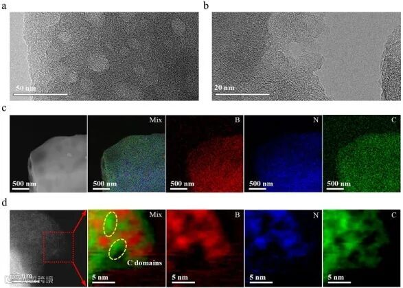 扫描透射电子显微镜–电子能量损失谱(STEM-EELS)结果(图2d)显示,B和N在空间分布上重叠,而C则以3-5 nm尺寸的domain形式存在,其分布与B和N呈互相嵌套关系。据此推测,催化剂可能由嵌入氮化硼基体中的纳米石墨烯构成,这与二者均具备六方结构特征相吻合。