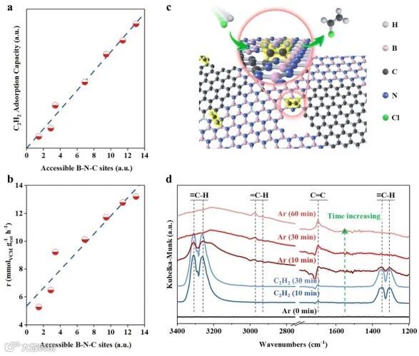 图4. B–N–C位点的催化作用。(a)根据积分C2H2‑TPD信号得到的C2H2吸附容量和(b)VCM生成速率随可及B–N–C位点含量的变化。(c)BNCMF的结构示意图及乙炔氢氯化反应。(d)BNCMF上C2H2吸附的原位DRIFTS谱。