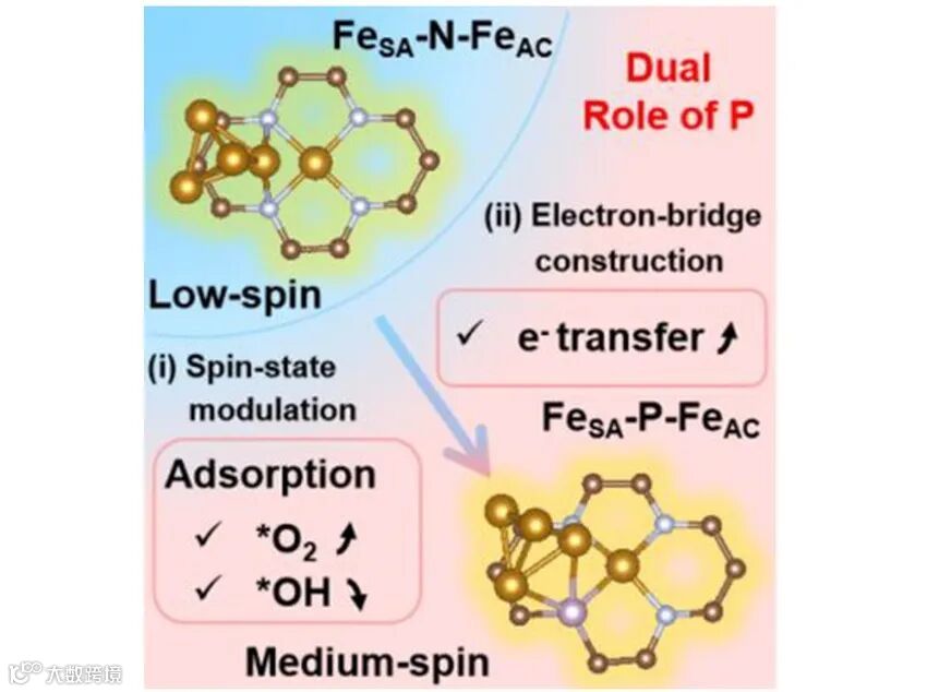 图1. 催化剂设计理念:独特的FeSA-P-FeAC磷桥连结构不仅作为电子桥,而且作为“自旋触发器”,诱导Fe中心从低自旋态向中自旋态转变。