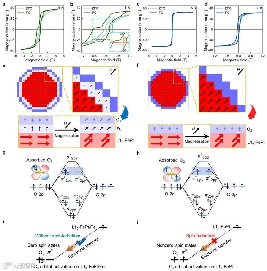 氧还原反应(ORR)是可持续能源转换的关键,ORR面临着相关且连续的瓶颈:低效的O=O键裂解(吸附动力学限制)和三重态到单重态转变的自旋禁阻(自旋动力学能垒)。然而,在统一的材料范式中整合吸附和自旋双动力学仍然是一个根本性的挑战。近日,浙江大学王秀瑜、成正东和中国科学院化学研究所姚立团队在ACS Energy Letters 期刊发表了一项研究,提出两步连续动力学控制策略用于磁场增强氧还原反应,顺序优化吸附动力学和自旋动力学(图1)。该团队设计了一种磁性L10-FePt/Fe核壳催化剂,其具有化学有序的铁磁L10-FePt核和原子厚度的Fe壳。这种类单原子的Fe壳层将O2的吸附从Pauling式垂直顶点(Fe-O=O)重新配置为Yeager式平行桥接位点配位(Fe-O-O-Fe),从而优化了O2的吸附动力学(图2)。随后,铁磁交换耦合界面在磁场作用下诱导出一种自旋钉扎效应(钉扎比例约为70%),这有助于加入电子的自旋选择性翻转,从而在ORR过程中消除Yeager式吸附三重态O2与单重态H2O之间的自旋转换过程中的自旋禁阻动力学能垒(图3)。与商业Pt/C催化剂相比,这一策略实现了10.9倍比活性的增长,对自旋受限的电催化具有重要的意义。