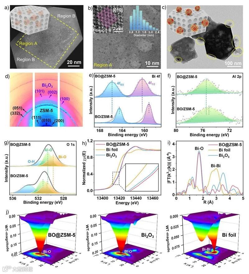 图2. 催化剂结构表征。a) BO@ZSM-5的HAADF-STEM图像,表征Bi2O3 NPs分布;区域A富Bi2O3 NPs,区域B几乎未观察到;插图示意BO@ZSM-5的结构。b) BO@ZSM-5的层析剖面TEM图像;左上插图示出沸石ZSM-5的微区,覆盖了来自[010]投影的结构模型;右上插图示出Bi2O3 NPs尺寸分布。c) BO/ZSM-5的TEM图像;黄色椭圆标出Bi2O3 颗粒;插图示出BO/ZSM-5的设想结构。d) BO@ZSM-5的同步辐射2D-XRD图谱。e) Bi 4f, f) Al 2p, g) O 1s的XPS光谱。h) Bi L3-边XANES, i) 傅里叶变换EXAFS, j) 各种样品的小波变换光谱。