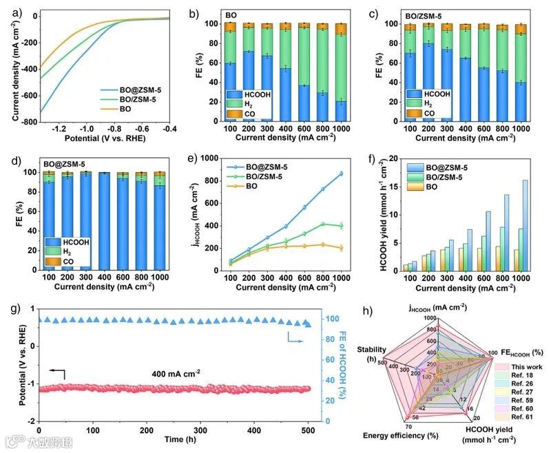 图3. 酸性CO2RR性能。a) 各种样品的LSV曲线。b) BO, c) BO/ZSM-5, d) BO@ZSM-5的产物分布和法拉第效率。e) 各种催化剂的HCOOH分电流密度和 f) HCOOH产率。g) BO@ZSM-5在400 mA cm-2电流密度下的稳定性。h) 与最近报道先进的CO2RR产甲酸/甲酸盐催化剂在HCOOH分电流密度、HCOOH法拉第效率、HCOOH产率、阴极能效和稳定性方面的性能比较。