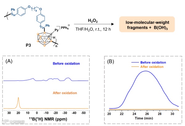 传统不可降解塑料引发的全球环境危机,亟需可持续替代材料的出现。得益于巢式碳硼烷固有的还原性,作者研究发现所合成的碳硼烷基高分子材料在温和的氧化条件下,其碳硼烷笼结构能发生断裂,最终降解为硼酸及低分子量有机小分子。11B{1H} NMR 和 GPC 分析结果充分证实了聚合物的完全降解(图3)。