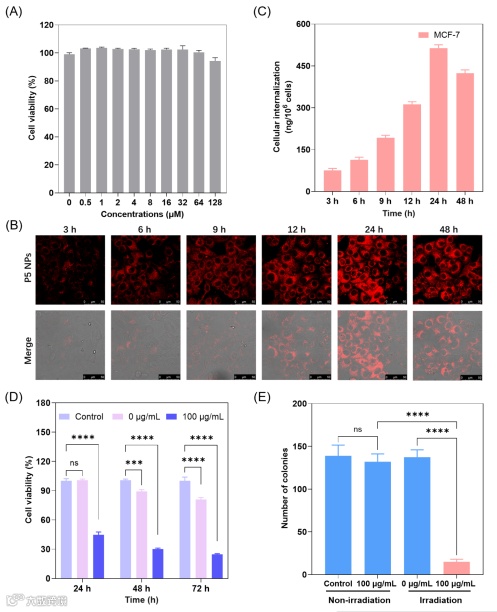 将三维大尺寸硼簇结构整合到聚合物主链中,不仅有效抑制固态下的π•••π相互作用,同时可导致聚合物在溶液中强烈的非辐射跃迁。因此,硼簇聚合物表现出聚集诱导发光(AIE)特性。作者系统研究了该硼簇聚合物的AIE行为(图4),并将其成功应用于生物成像。此外,得益于其高硼含量特性,该聚合物具备作为硼载体的应用潜力。后续研究表明,基于该聚合物构建的药物递送系统,在中子照射下可实现对肿瘤细胞的高效杀灭,显示出优异的BNCT应用潜力(图5)。