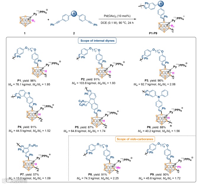 为精准调控聚合反应位点与反应活性,作者选用巢式吡啶碳硼烷作为单体,与内炔进行逐步聚合反应。还对关键反应参数,包括两单体比例、浓度、催化剂及其用量进行了系统优化。为评估该聚合反应的普适性并拓展所得聚合物的功能多样性,作者在优化条件下考察了多种内炔与巢式碳硼烷单体。结果表明,相应的碳硼烷基聚合物均能以高产率和高分子量获得(图2)。值得一提的是,该聚合过程具有显著优势,例如实现100%的原子经济性,且无需使用任何牺牲性试剂。