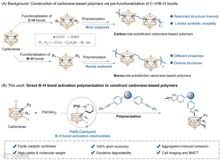 硼簇(如碳硼烷 C2B10H12)是一类多面体硼氢化合物,其表面分布着多个(~ 10个)B–H键,具有独特的结构特征和物理化学性质。这些特性使得硼簇衍生物在从材料科学到药物化学的广泛领域中展现出极高的应用价值。然而,B–H键化学极性小、键能高,且数目众多、化学环境相似,因此硼簇的选择性官能团化极具挑战性。尽管基于B–H键活化的合成策略已被用于制备结构多样的碳硼烷小分子化合物,但将B–H键活化拓展至高分子合成领域,特别是通过直接的B–H键活化聚合策略制备多功能聚合物,此前研究未见报道。其难点主要在于:在保持高效聚合的同时,精确控制多个位点的区域选择性B–H键活化是一个巨大的挑战。