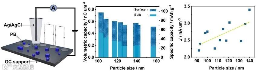 图1. (左)SECCM测试单颗粒普鲁士蓝示意图。(中)K+存储与普鲁士蓝颗粒尺寸的关系。(右)电催化H2O2还原与普鲁士蓝颗粒尺寸的关系。图片来源:J. Am. Chem. Soc.