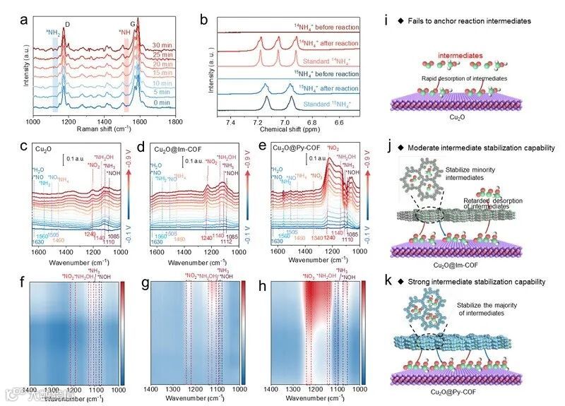 图3. 电化学eNO₃RR过程的原位光谱分析。原位(a) Cu₂O@Py-COF的拉曼光谱和(b) 使用¹⁵NO₃⁻作为氮源的Cu₂O@Py-COF在电解前后的¹H NMR光谱。在不同施加电位下(从−0.1到−0.9 V vs RHE)获得的原位FTIR光谱:(c) Cu₂O, (d) Cu₂O@Im-COF, (e) Cu₂O@Py-COF。对应的2D FTIR等高线图:(f) Cu₂O, (g) Cu₂O@Im-COF, (h) Cu₂O@Py-COF。NO₃RR在(i) Cu₂O, (j) Cu₂O@Im-COF, (k) Cu₂O@Py-COF上的拟机理示意图。