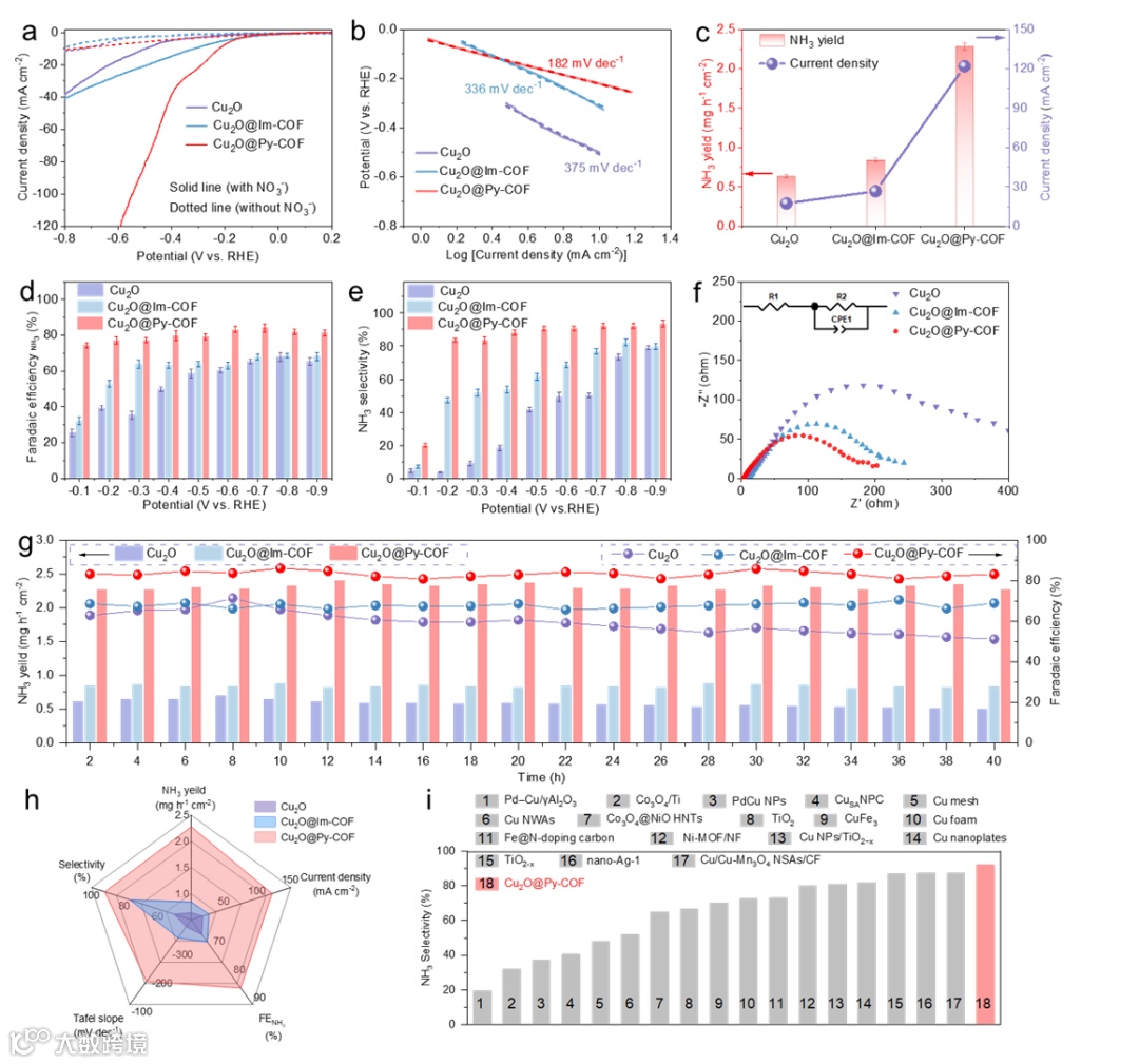 图2. Cu₂O@COF核-壳电催化剂的NO₃RR性能。(a) 在Ar饱和的0.1 M Na₂SO₄中,不含和含有NaNO₃时的LSV曲线。(b) 不同电位下的Tafel图。(c) 在−0.7 V vs RHE下测量的NH₃产率和电流密度比较。(d) 电位依赖的法拉第效率和(e) 氮选择性。(f) 原始Cu₂O NCs、Cu₂O@Py-COF和Cu₂O@Im-COF电催化剂的EIS奈奎斯特图。(g) 原始Cu₂O NCs、Cu₂O@Im-COF和Cu₂O@Py-COF在−0.7 V vs RHE和环境条件下进行40小时的稳定性测试。(h) Cu₂O@Py-COF、Cu₂O@Im-COF和原始Cu₂O NCs电化学NO₃RR性能的雷达图比较。(i) Cu₂O@Py-COF与近期报道的电催化剂的电化学NO₃RR选择性比较。