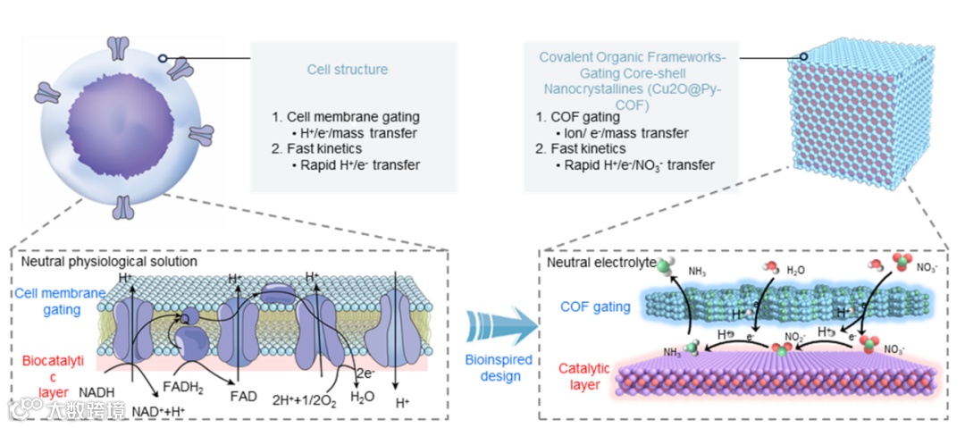 如何设计兼具高活性、高选择性与高稳定性的铜基催化剂,是实现eNO₃RR工业化应用的关键。在此,为了应对这一难题,四川大学李爽团队与柏林工业大学Arne Thomas团队受生物细胞膜调控物质传输与反应微环境的启发,提出了一种“COF门控”策略:在Cu₂O纳米立方体表面原位生长具有明确孔道与功能基团的共价有机框架壳层,构建Cu₂O@COF核壳结构。该设计旨在实现以下功能:(1)选择性物质传输:COF孔道作为“分子门控”,调控反应物(NO₃⁻、H2O)与产物(NH₃)的扩散;(2)中间体稳定:COF中的含氮官能团通过氢键、路易斯酸碱作用稳定中间体,引导反应路径;(3)界面电子调控:COF与Cu₂O之间的电子耦合优化表面电荷分布,提升电子转移效率。