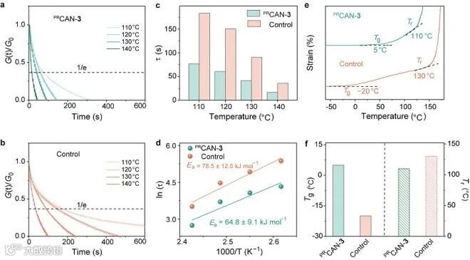 图4. PRCAN-3(a)和对照(b)在不同温度下的归一化应力松弛曲线;PRCAN-3与对照样品在不同温度下的特征松弛时间(c)及其阿伦尼乌斯分析(d);(e)PRCAN-3与对照样品的热膨胀应变随温度的变化曲线;(f)PRCAN-3与对照样品的玻璃化转变温度(Tg)和加工相关温度(Tr)。