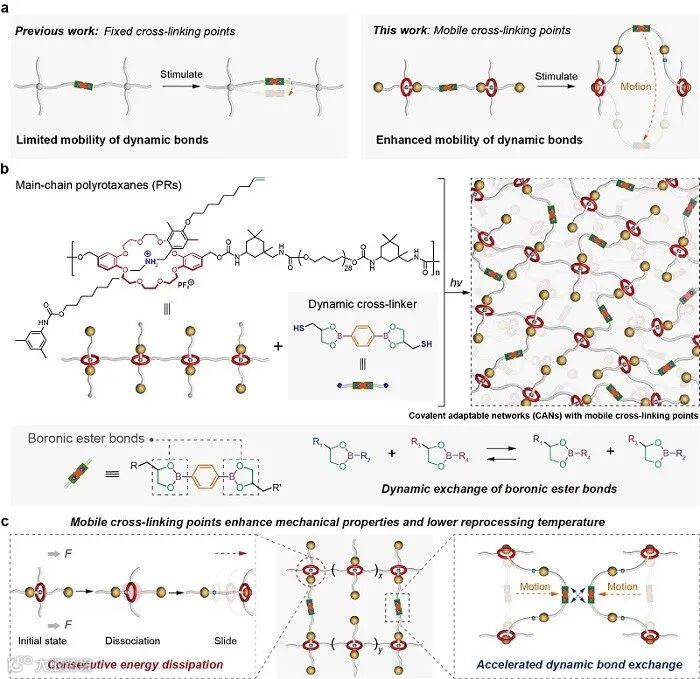 图1. (a)传统固定交联点与本工作中的可移动交联点的对比示意图;(b)PRCANs的形成示意图;(c)交联点运动增强能量耗散并加速动态键交换的机理图。