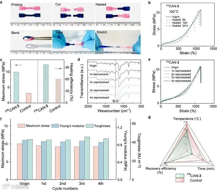 图5.(a)PRCAN-3薄膜的自修复示意;(b)PRCAN-3薄膜在100 ℃下不同愈合时间的拉伸应力-应变曲线;(c)PRCAN-3与对照在100 ℃下愈合24小时后的拉伸断裂强度和自修复效率对比;(d)PRCAN-3经四次再加工循环后的ATR-FTIR的光谱;PRCAN-3经四次再加工循环后的拉伸应力–应变曲线(e)及性能总结(f);(g)PRCAN-3与对照样品的加工性能对比雷达图。