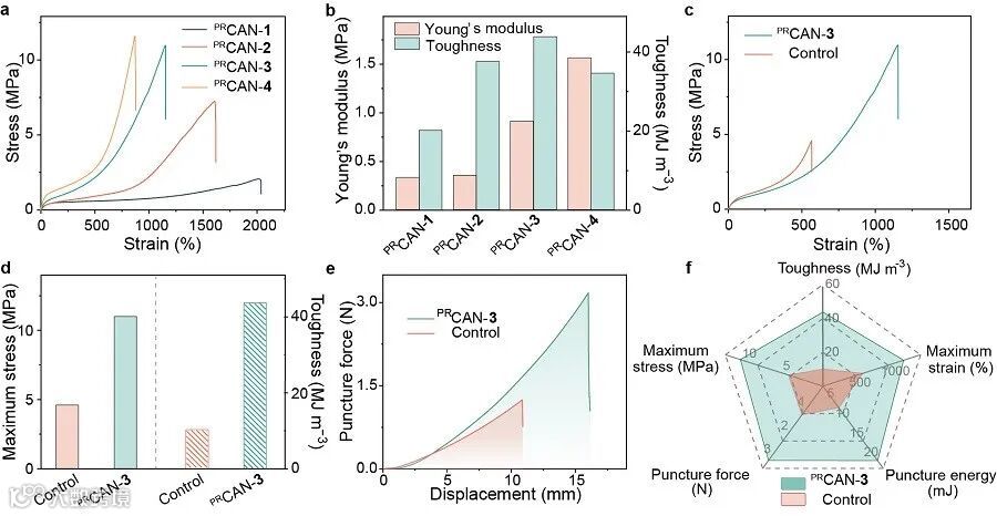 图2. PRCANs-1–4的应力–应变曲线(a)及其杨氏模量与韧性(b);PRCAN-3与对照样品的应力–应变曲线(c)及其断裂应力与韧性(d);(e)PRCAN-3与对照样品的穿刺力–位移曲线;(f)PRCAN-3与对照样品的关键性能对比雷达图。