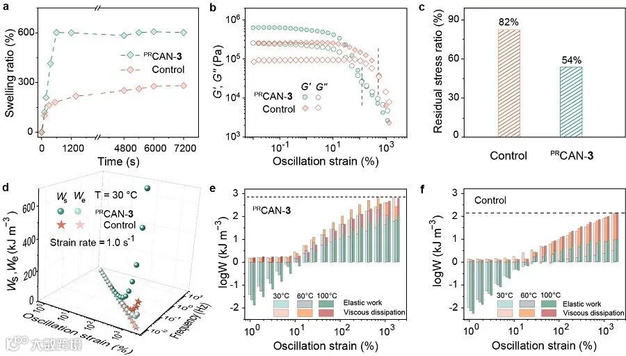 图3.(a)PRCAN-3与对照在DMF中的溶胀比曲线;(b)PRCAN-3与对照的应变扫描曲线;(c)时间扫描测试中PRCAN-3与对照的残余应力比;(d)PRCAN-3与对照的粘性耗散能(Ws)和储存弹性能(We)随应变和频率的三维散点图;PRCAN-3(e)和对照(f)在不同温度下的Ws和We。