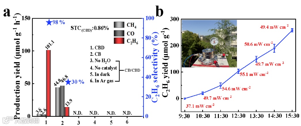 图2.(a)氙灯光照和(b)自然光照下的C2H6生成性能。图片来源:Angew. Chem. Int. Ed.