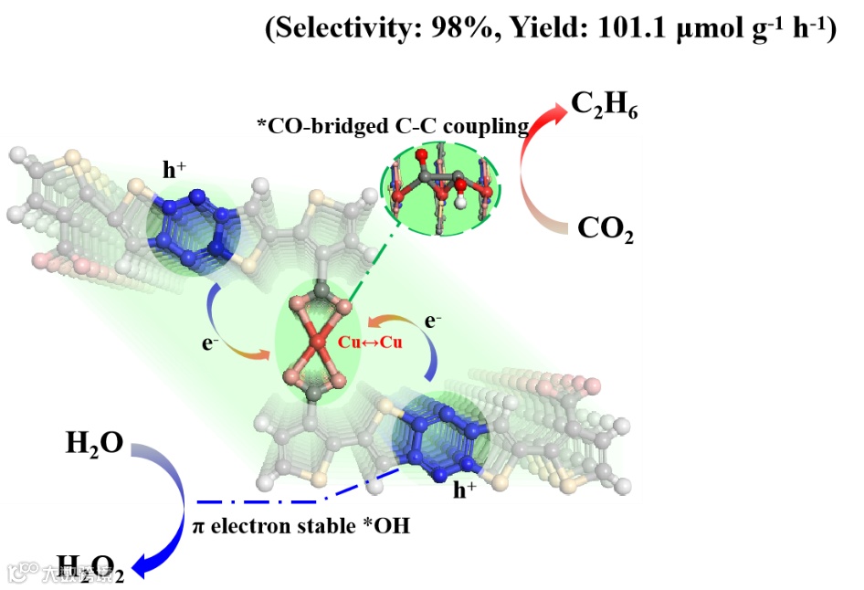 在纯水条件下将二氧化碳还原为高价值C2产品,是应对能源危机的可持续策略。然而,C2产物的合成受限于水氧化为氧气的缓慢动力学,导致空穴严重积累并显著降低电子利用率,严重阻碍了C-C偶联反应。近日,江南大学董玉明教授团队制备并合成了一种基于共轭堆叠噻吩的苯环功能化超分子催化剂,实现了CO2高活性高选择性还原产C2H6。