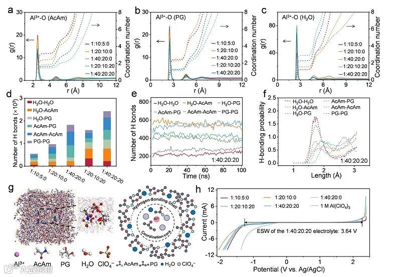 随着体系由无水向含水 DEE 过渡,Al³⁺ 的第一配位层逐渐由有机分子转向水和 ClO₄⁻,而有机组分更多参与构建外层氢键壳。氢键统计与分布分析表明,在 1:40:20:20 体系中,不同类型氢键数量接近、结构稳定,支撑了所提出的双层溶剂化模型,并使电化学稳定窗口拓宽至 3.64 V。