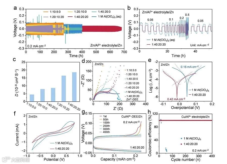 在电化学行为方面,图3表明该 DEE 在 Zn//Zn 对称电池中显著降低了极化电压,并实现了长时间稳定沉积/剥离。对比不同金属基底发现,Zn 是最有利于 Al 沉积的载体,而 1:40:20:20 Al³⁺-DEE 兼具最低界面阻抗、最高交换电流密度和最快离子扩散特征。
