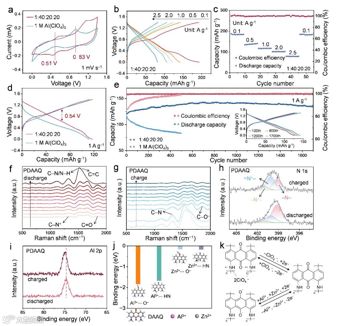 该体系在 1 A g⁻¹ 下实现 135 mAh g⁻¹ 的可逆容量,并在 1700 圈后仍保持 94% 容量,同时表现出更高的电压平台和更低极化。原位拉曼、XPS 与 ICP-OES 分析表明,PDAAQ 中羰基和亚胺位点优先与 Al³⁺ 配位,Zn²⁺ 提供辅助电荷补偿,形成稳定的协同储能机制。