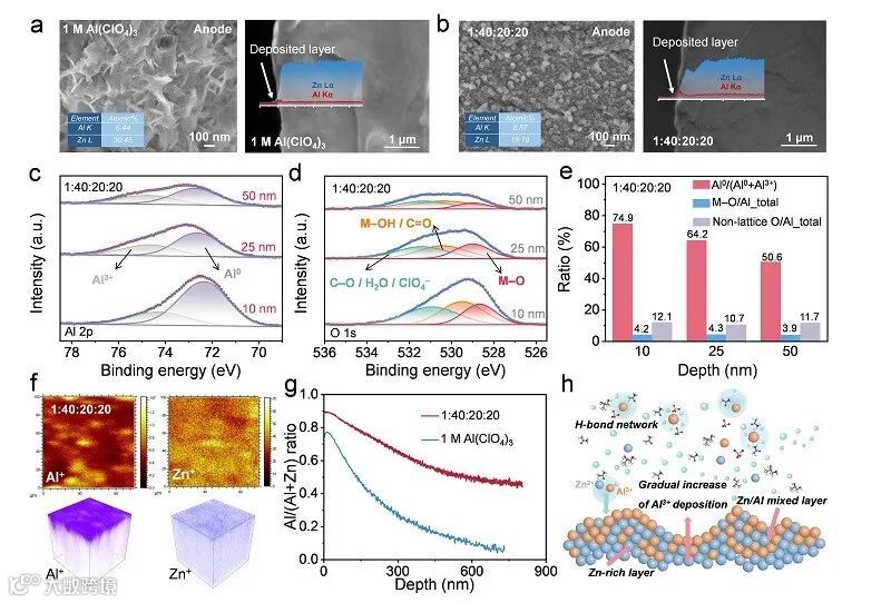 图4. SEM/EDS、XPS 深度剖析与 TOF-SIMS 三维重构,系统对比 Al(ClO₄)₃ (aq) 与 Al³⁺-DEE 中 Zn 表面的沉积行为。