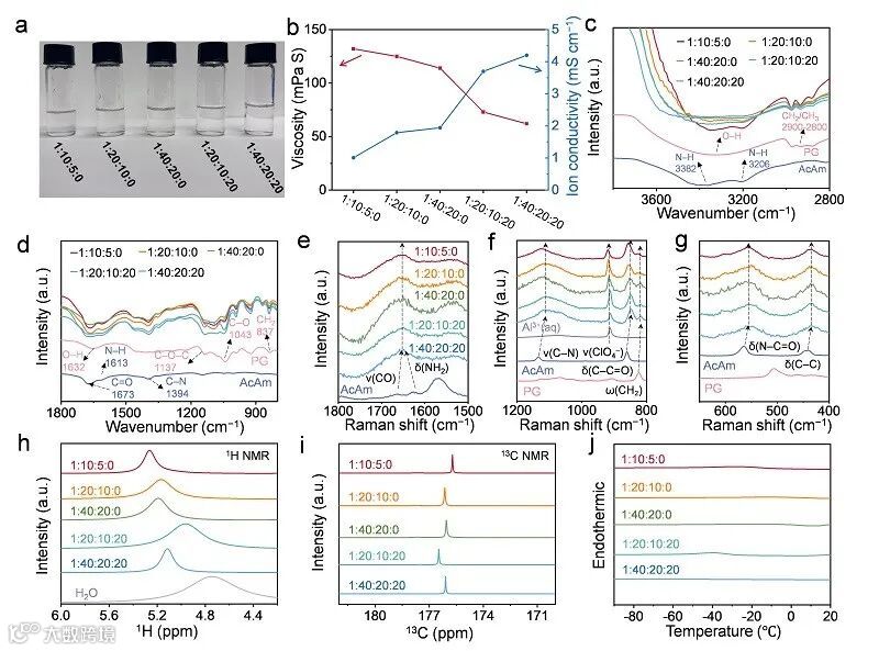 随着乙酰胺和丙二醇含量增加,电解液逐渐形成稳定透明液体,并在适量引入水后显著降低粘度、提升离子电导率。FTIR、Raman 以及¹H/¹³C NMR 共同证实,多组分之间形成了高度耦合的氢键网络,而 DSC 结果显示其熔点被大幅压低至 −90 °C 以下,体现出典型的深共晶特征。