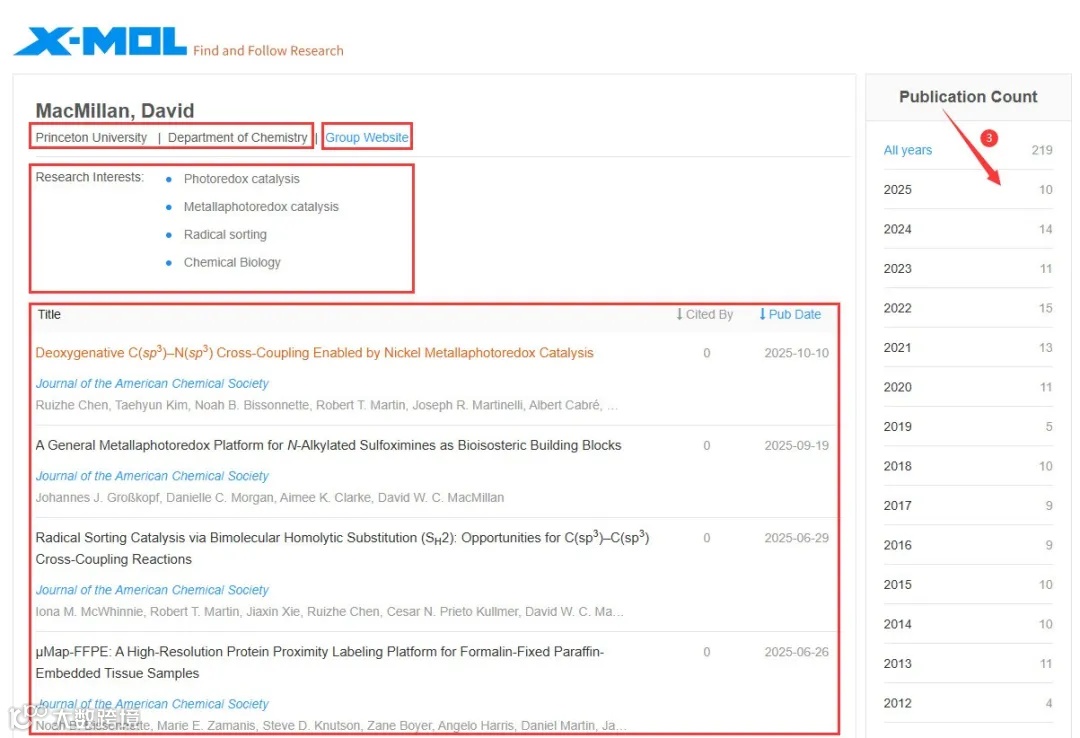 列表页集中展示了我们选出的有机合成领域Top Researchers的相关信息,您可根据需要调整排序条件(见红框内带箭头的项目)进行浏览。点击学者姓名所在行即可进入其详情页浏览其论文。