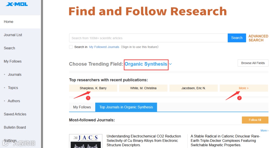 电脑访问https://www.x-mol.net,选择“Organic Synthesis”进入有机合成领域概览页。点击页面上任意一位Top Researchers的姓名(见图标①),即可进入其详情页;点击“More”(见图标②)即可进入完整列表页查找该领域的其他Top Researchers或浏览全部。