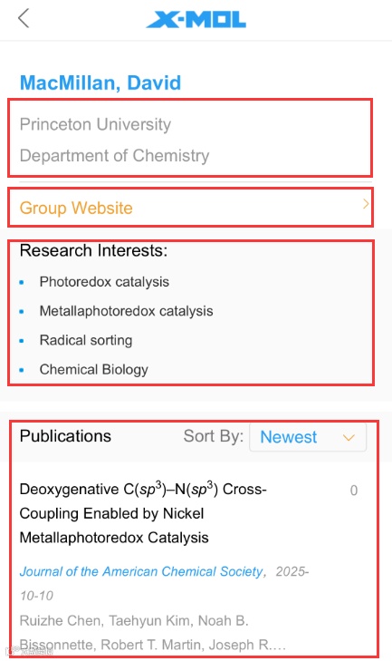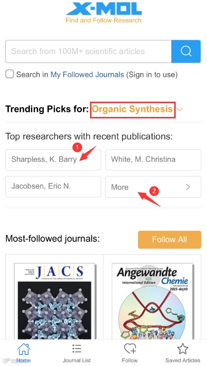 手机访问https://m.x-mol.net,选择“Organic Synthesis”进入有机合成领域概览页。点击页面上任意一位Top Researchers的姓名(见图标①),即可进入其详情页;如需查找该领域的其他Top Researchers或浏览全部,请点击“More”(见图标②)进入完整列表页。