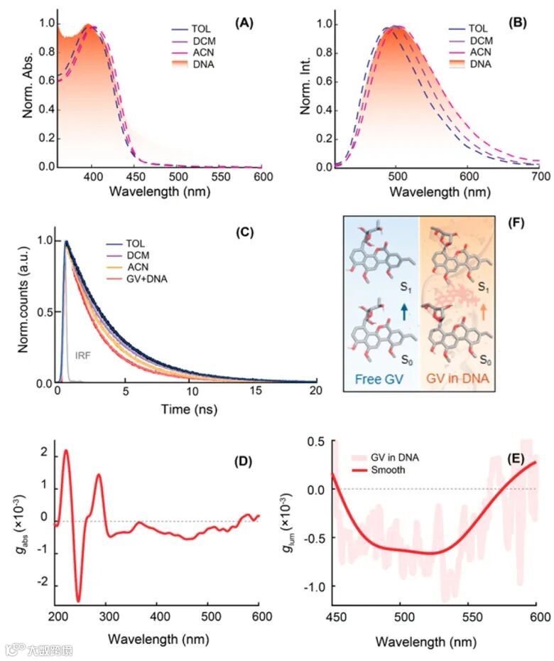 研究以天然抗生素褐黄癌菌素V(GV)为模型,实验发现,GV的三重态量子产率从溶液中的7.6%显著提升至DNA环境中的25.8%,增幅超过3倍。研究进一步揭示,这一增强源于DNA手性环境对GV激发态手性的放大作用,同时激活了从Franck-Condon区域的直接系间穿越,以及从电荷转移态介导的自旋轨道电荷转移系间穿越(SOCT-ISC)的双重通道。首先,该工作系统表征了GV在不同溶剂和DNA中的稳态光谱特征。吸收光谱显示,GV在约400 nm处存在特征吸收峰,对应其ππ*跃迁。嵌入DNA后,吸收谱形基本保持,但在圆二色谱(CD)中于300-550 nm范围内出现明显的负诱导圆二色信号,证实了DNA手性环境对GV电子态的直接影响。同时,稳态圆偏振发光(CPL)光谱在450-650 nm范围内观测到宽谱带发射,直接证明了GV在DNA双链中产生了激发态手性(图2)。此外,荧光光谱则表现出显著的溶剂依赖性及DNA嵌入后的谱带展宽,并结合时间相关单光子计数技术测得的荧光寿命变化,共同指征了激发态涉及显著的电荷转移特征。