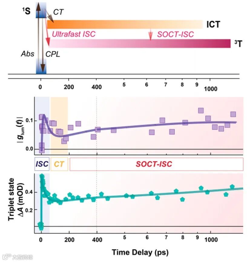 图4. 飞秒时间分辨圆偏振发光信号与三重态形成动力学的实时关联分析。