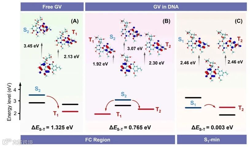 量子化学计算进一步从电子结构层面阐明了机制。DNA的螺旋手性环境不仅增加GV分在的结构刚性,还显著增强了其磁跃迁偶极矩,同时缩小了关键的单重态-三重态能隙,从而协同促进了自旋轨道耦合与系间穿越速率。