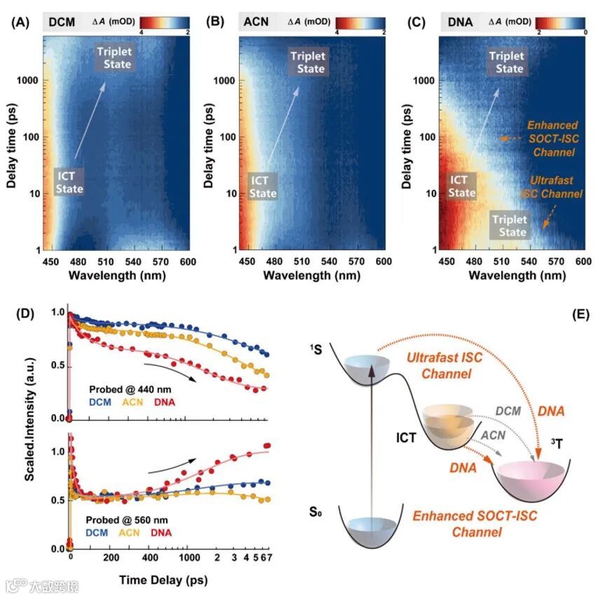 飞秒瞬态吸收光谱为阐明三重态生成途径提供了关键动力学证据(图3)。在所有测试体系中,均观测到位于560 nm附近、寿命长于7 ns的激发态吸收信号,该信号被指认为三重态特征峰。动力学分析表明,DNA嵌入后的GV表现出独特的多时间尺度三重态生成过程:三重态信号在光激发后约1 ps内即快速出现,同时还存在一个纳秒尺度的增长分量。进一步的全局分析拟合出各瞬态物种的演化相关的差值光谱,并通过特征波长(如440 nm处衰减与560 nm处增长)的反关联动力学,明确了单重态电荷转移态作为三重态前驱体的角色。
