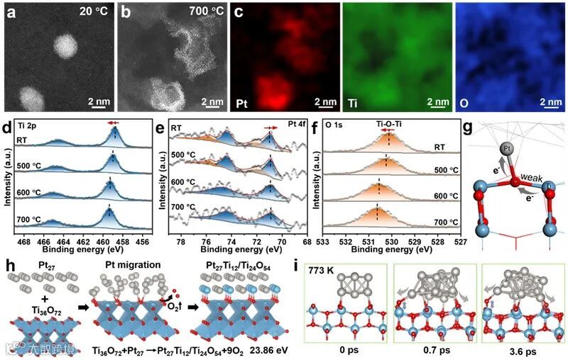 本文亮点包括:(1)机制突破。首次在原子尺度直接观测到RMSI过程中的反向扩散路径与单原子层Pt中间态,刷新了对金属-载体相互作用动态过程的基础认知。(2)理论验证。结合DFT计算与分子动力学模拟,从能量与动力学角度证实了单原子层Pt的形成能削弱Ti-O键、促进氧空位生成,从而驱动Ti迁移与合金化的微观机制。(3)性能卓越。基于新机理指导合成的Pt3Ti/TiO2催化剂,其Pt位点d带中心下移,在电催化氢氧化反应中表现出高活性与卓越的抗CO中毒性能。