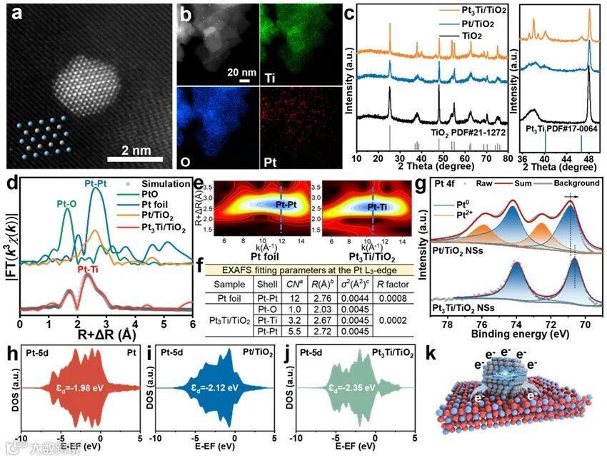 图3. Pt3Ti IMC/TiO2催化剂的结构与电子表征。