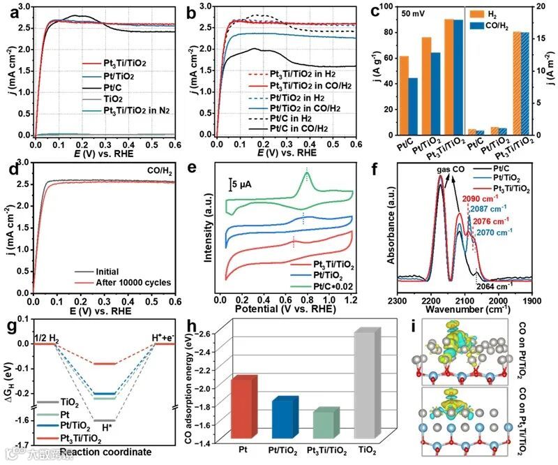 图4. 电催化氢氧化(HOR)性能与抗CO中毒研究。