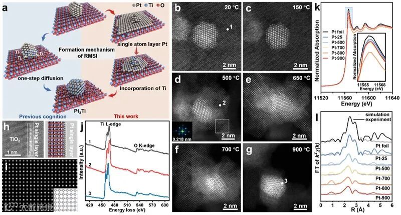 为揭开RMSI原子尺度演化的神秘面纱,林岳及洪勋团队选择了经典的Pt/TiO2模型体系,并运用了原位加热球差校正高角环形暗场扫描透射电子显微镜(in situ heating AC-HAADF-STEM)。该技术能够在原子分辨率下,实时观测催化剂在高温下的结构动态变化,是捕捉瞬态中间结构的利器。与“一步直接扩散”的传统认知不同,研究者们在此次观测中捕捉到了一个令人意外的关键中间步骤:在Ti原子融入Pt之前,Pt纳米颗粒自身首先发生了“铺展”行为,在TiO2载体表面形成了大面积、连续的单原子层Pt结构。这一发现颠覆了既有认知,暗示RMSI可能遵循一条先反向扩散(Pt向外)、再正向合金化(Ti向内)的全新路径。本研究的核心,便是围绕这一新发现的“单原子层中间态”,综合利用多种原位表征技术与理论计算,系统阐明其在RMSI过程中的形成原因、结构作用、电子效应,并最终指导合成出性能显著提升的Pt3Ti金属间化合物催化剂。