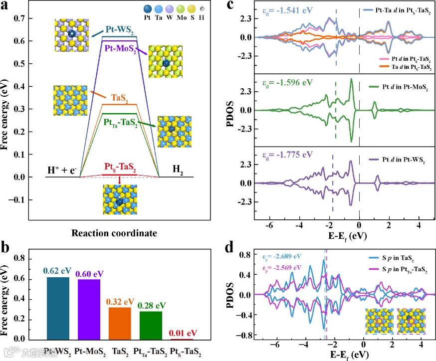 DFT计算结果进一步表明,Pt单原子通过激活与其相邻的S原子进一步增强1T-TaS2的基面活性,1T-TaS2通过从Ta到Pt的异常电荷转移调节Pt原子的d带中心以增强Pt原子的催化活性。这种独特的“相互激活”效应可以有效调节氢吸附自由能,协同增强催化剂的性能。