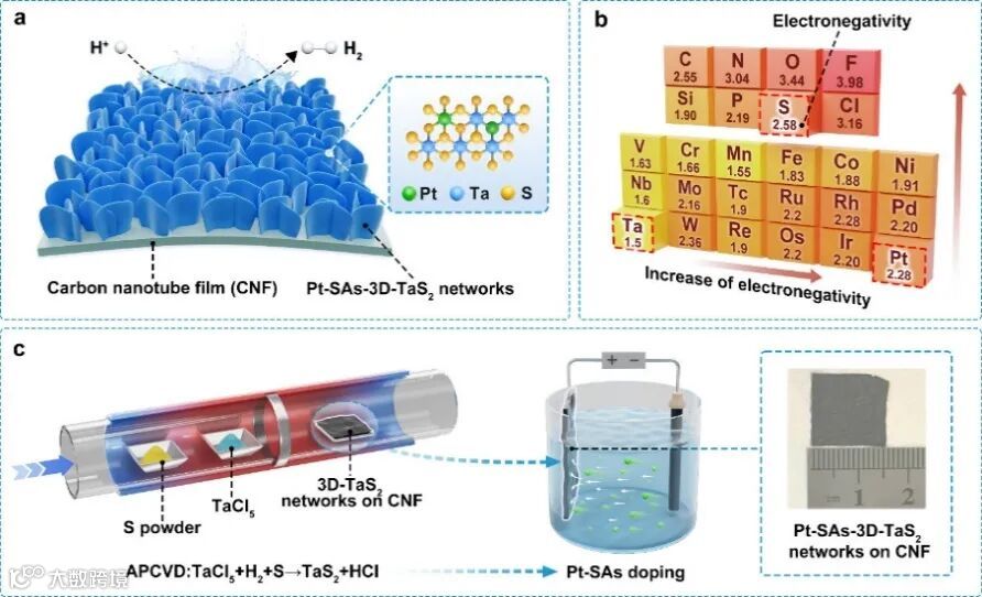 近日,北京大学张艳锋教授团队结合其前期工作基础,在碳纳米管薄膜上通过化学气相沉积方法构筑了垂直取向的1T-TaS2纳米片网络,并通过电化学方法在1T-TaS2晶格中实现了均匀的Pt单原子掺杂(图1)。该催化体系具有以下显著优势:1. 垂直纳米片网络同时具有丰富的边缘和基面催化活性位点;2. 碳纳米管薄膜具有高的导电性,有利于电荷传输;3. Pt单原子和1T-TaS2基面位点可以通过“相互激活”效应优化氢吸附自由能,协同增强催化剂整体的性能。