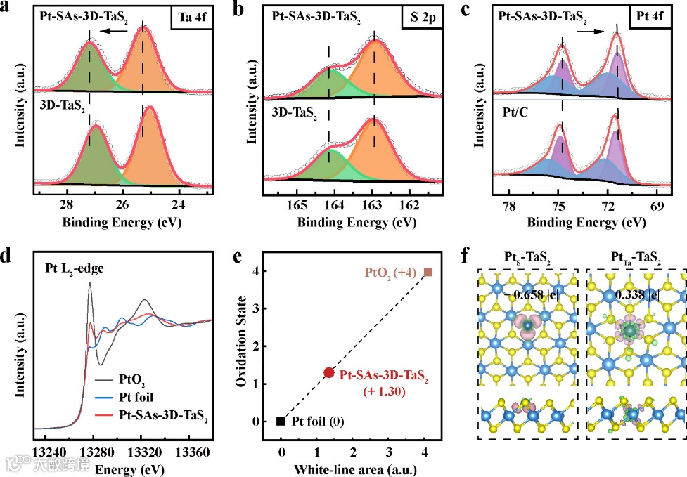 XPS、XANES结合DFT计算结果表明,两种构型的Pt单原子均引起了1T-TaS2中电子的重新分布,使得Pt单原子处于较低的平均价态。其中,Pt占据S位点的构型促进了电子从Ta到Pt的反向电荷转移,调控了Pt的电子结构。