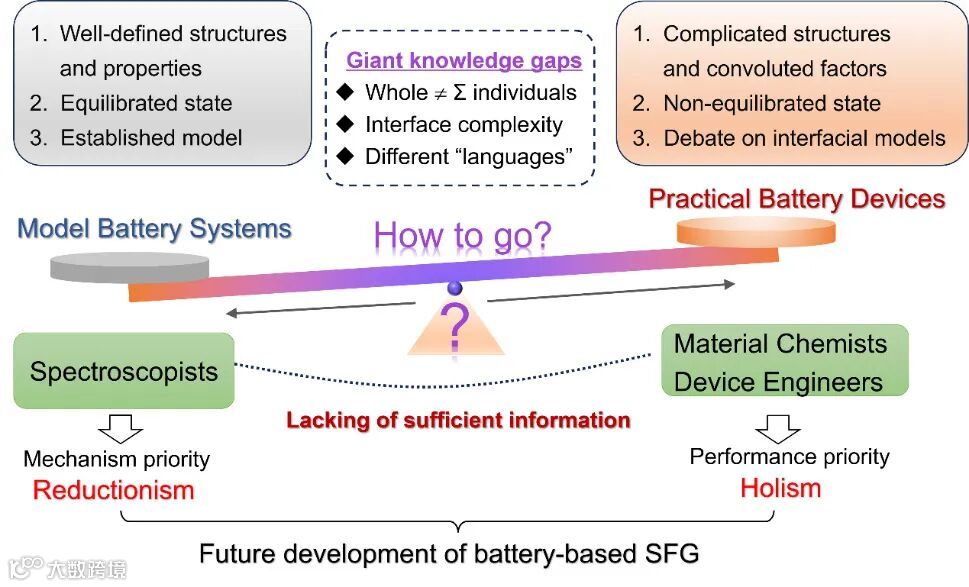 尽管原位SFG测量在界面表征方面取得了显著进展,但大多数研究集中于简单的模型体系,与实际应用条件相去甚远(图2)。例如,光谱学家主要关注稳态下结构和性质明确的体系以及已建立的模型所揭示的机制,而对于材料化学家而言,构建复杂结构和非平衡态才是电池性能的首要任务,这说明SFG在电池领域未来发展所需的提供信息不足。利用SFG直接获取具有粗糙形貌的实际体系的信息在技术和理论上仍然面临挑战。但研究团队展望了其未来发展方向:拓展远红外光谱检测范围、引入CN-/SCN-等界面指示剂、结合机器学习解析复杂光谱信号,以及将技术延伸至钠、锌、镁等后锂电池和固态电池领域。此外,SFG与X射线吸收光谱、拉曼/红外、XPS等技术的联用,将构建多尺度原位表征体系,全面揭示界面结构-性能关联机制。