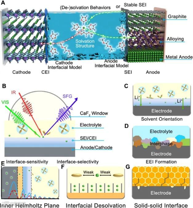 当前,锂电池的充放电过程主要展现为Li+在正负极间的穿梭迁移,而电极/电解质界面形成的分子状态、固体电解质界面相(SEI)、正极电解质界面相(CEI)对电池库仑效率、循环寿命和安全性起着至关重要的作用。但SEI/CEI的形成机制、演化规律及界面Li+去溶剂化动力学等关键问题,因缺乏高时空分辨率的原位/operando表征手段,始终存在诸多争议。传统表征技术如电子显微镜、X射线光谱等难以捕捉界面分子级动态过程,而SFG光谱凭借其独特的界面选择性、高灵敏度和相干特性,成为可视化电池界面的“利器”。